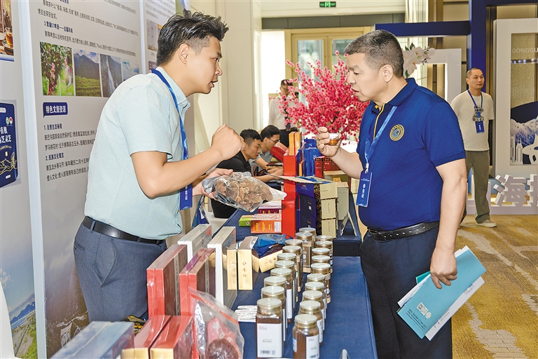参会嘉宾向林芝参展企业了解展陈商品情况。本报记者 谢筱纯 刘枫 摄