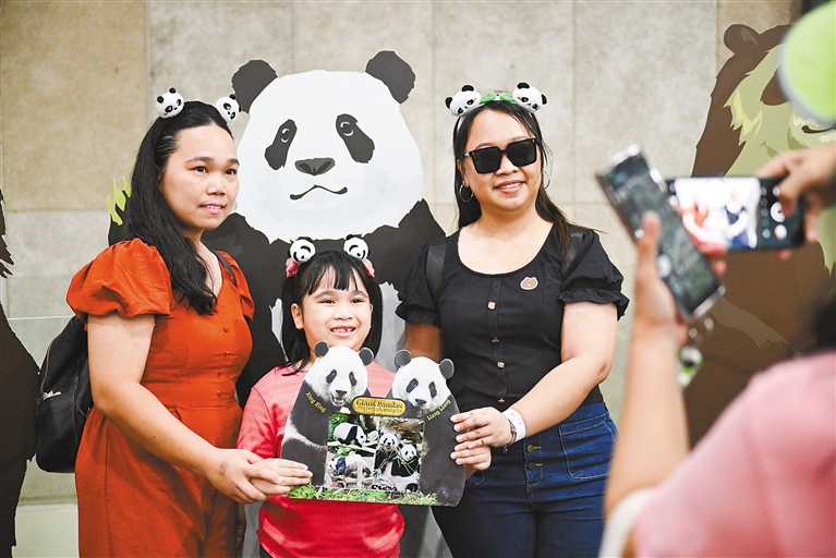 图为5月17日,在马来西亚吉隆坡的国家动物园,人们在大熊猫馆内举着大熊猫“兴兴”和“靓靓”的牌子合影。