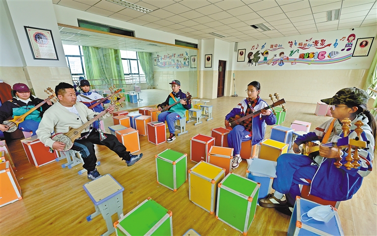 图为拉萨市第四中学学生在扎念琴社团课上与老师共同弹奏扎念琴。