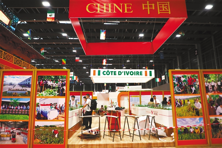 科特迪瓦第七届国际农业和动物资源展23日在阿比让国际会展中心开幕。作为本届农展会主宾国,中国参展方在展厅中心设立了红色主色调的中国馆,向观展者展示智慧农业蓝图、橡胶加工厂沙盘、专业农机等中国先进农业技术和机械。