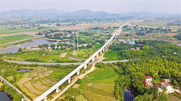 图为建设中的铜陵江北港铁路专用线(5月26日摄,无人机照片)。新华社记者 周牧 摄