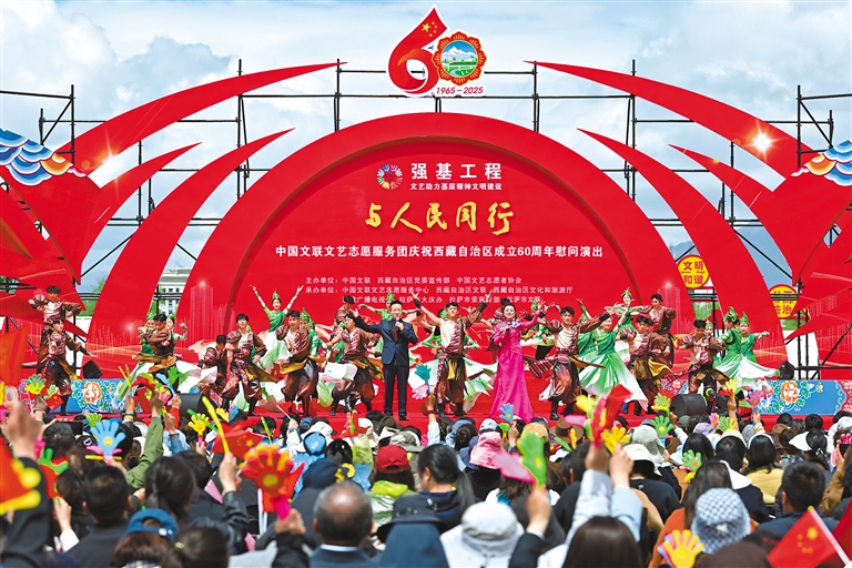 上午10时整,“与人民同行”中国文联文艺志愿服务团庆祝西藏自治区成立60周年慰问演出,在歌舞《鼓舞西藏》的热烈氛围中正式开场。