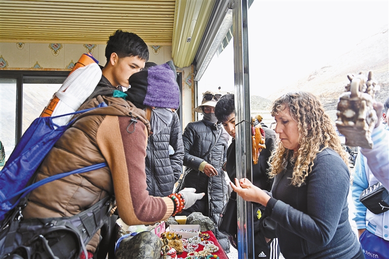 新奇感过后,游客们开启购物模式。“阿佳,这个挂饰可以定制吗?”“你们可以发快递吗?”对于一连串的问题,阿佳格桑忙碌地一一回答着,“你们想要什么图形,我们就给你定制什么图形。”“我们这儿快递很快,今天下单明天就给你发!”短短半个小时,“阿佳格桑工坊”的生意火爆,销售藏式靠垫、藏式地毯、挂饰等特色产品4000多元。“回去后,我要通过自媒体平台,宣传这次西藏之旅的所见所闻,让更多亲朋好友来西藏旅游!”日本游客琴音有感而发。