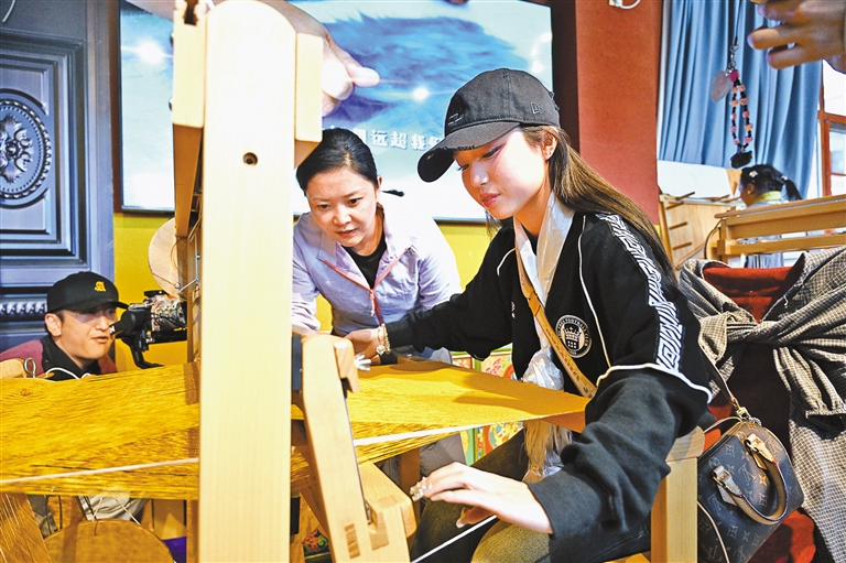 在江孜县“阿佳格桑工坊”,工坊负责人阿佳格桑和江孜县群团工作部党组书记、部长央吉向刚到的日本游客献上洁白的哈达,欢迎远道而来的客人。走进工坊,游客们被精美的藏族氆氇技艺震撼,看着藏族妇女正在编织,便跃跃欲试。在央吉的带领下,日本游客纷纷踏上编织机,有模有样地学起了编织,竖起拇指称赞不断。