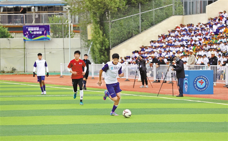 以球为媒,“球”同存“谊”。5月20日下午,中国日喀则市珠峰雪鹰队与阿根廷萨尔塔普纳队在日喀则市上海实验学校体育场上演了一场跨越山海的青少年足球友谊赛。赛场上,双方球员迅速进入状态,团结配合、积极拼抢,用细腻的脚法,或急停、或变向、或假动作,轻松晃过对手,射门得分,给观众呈现了一场精彩的足球比赛。