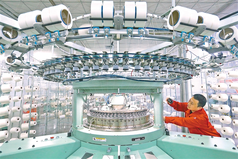 图为5月19日,山东省青岛市即墨区龙山街道一家纺织企业的工人在生产出口海外市场的服装面料。新华社发(梁孝鹏 摄)