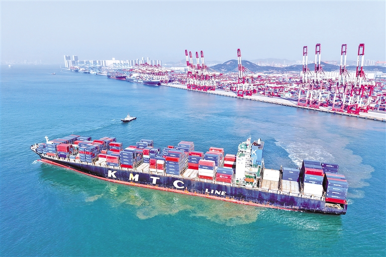图为5月19日,山东港口青岛港,装载外贸集装箱的货轮驶出港口(无人机照片)。新华社发(俞方平 摄)