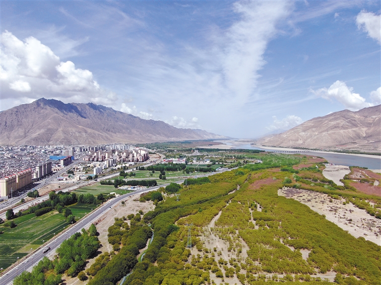 配图:雅江中游“百里绿色生态长廊”与日新月异的山南市区和谐共生,展现出高原独有的生态之美(无人机照片)。本报记者 武沛涛 摄