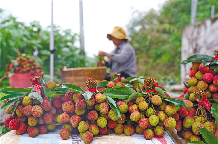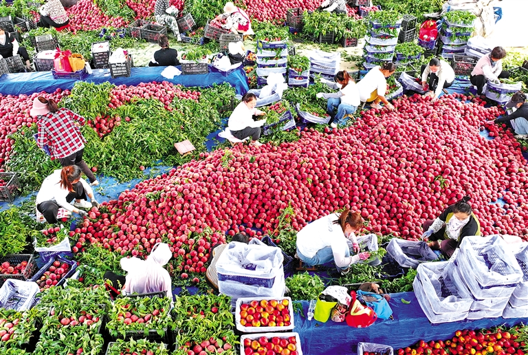 6月10日,在云南省屏边苗族自治县玉屏镇荔枝种植基地,村民在地头挑拣荔枝。新华社发(梁志强 摄)