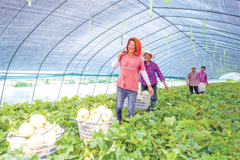 6月10日,在江苏省兴化市陈堡镇曹黄村,农民在搬运刚刚采摘的瓜果。新华社发(周社根 摄)