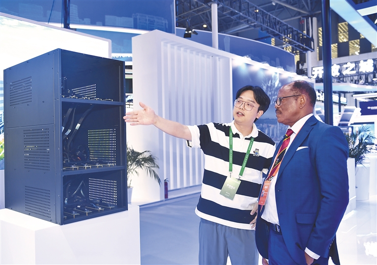 图为参展商在向外宾介绍展出的高性能GPU服务器。