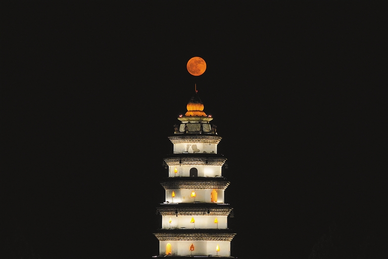 图为6月11日在四川省阆中市拍摄的悬挂在明代白塔塔尖的满月(无人机照片)。新华社发