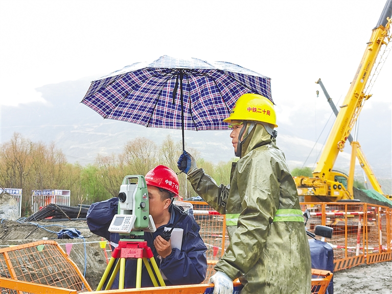 ▲施工人员冒雨工作,抢抓工期。本报记者 武沛涛 摄