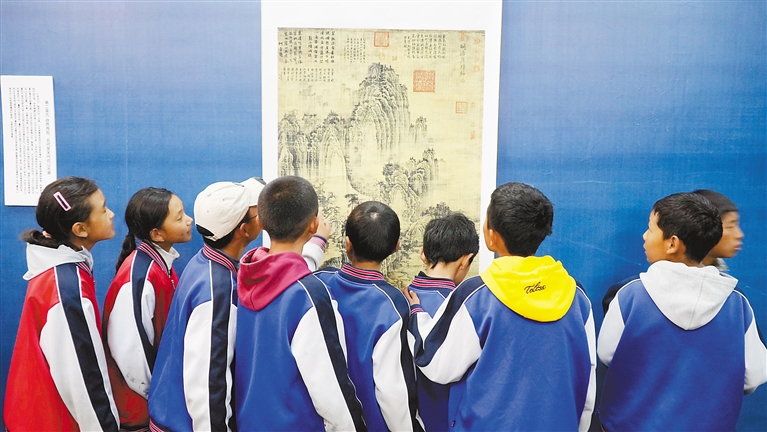 近日,“金彩桑日 传承未来”中华优秀传统书画数字艺术展在桑日县举办。展览运用数字化手段,对90余幅中华传统精品书画作品进行高清复刻与呈现。观众在现场不仅能够近距离欣赏书画作品的精妙细节,还可以通过扫描二维码,深入了解相关作品的创作背景、艺术风格以及作者生平。 图为桑日县中学学生在欣赏五代时期画家荆浩的作品《匡庐图》。 本报通讯员 阿旺金巴 摄