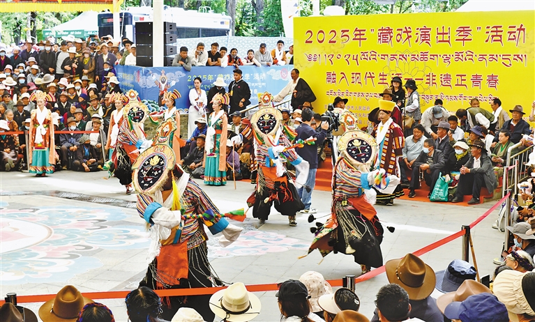 6月13日,以“融入现代生活——非遗正青春”为主题的2025年“藏戏演出季”活动在拉萨市宗角禄康公园举行。本次活动由非遗体验、产品展销、藏戏展演三个部分组成,精彩的表演吸引了众多市民游客观看。 图为活动现场,拉萨市堆龙德庆区措麦藏戏队带来的藏戏剧目《智美更登》。本报记者 旦增兰泽 摄