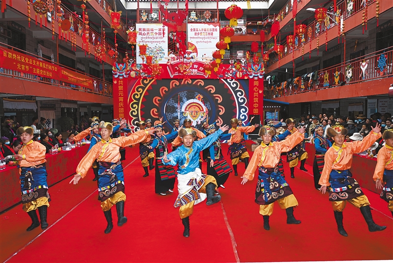 图②:2025年2月23日,吉崩岗街道德赛大院开展庆元宵活动,雪巴拉姆艺术团舞蹈演员正在表演节目。(资料图片)