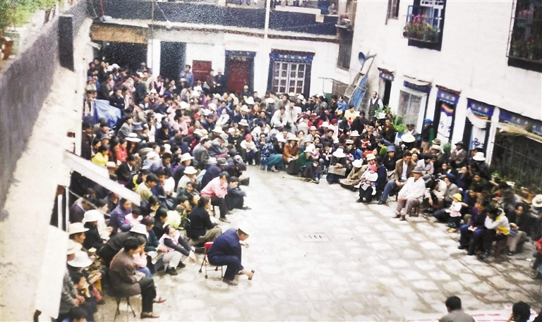 在当时拍的另一张照片上,几十位居民挤在过道里准备投票。“那时候院子小,选举时得侧着身子站。”德吉卓嘎回忆道,“院子窄小,雨天积水,但丝毫不影响大家参与社区事务的热情。”照片的一角,13岁的普布普赤正躲在母亲身后好奇张望,如今她41岁,已成长为大院的户长。