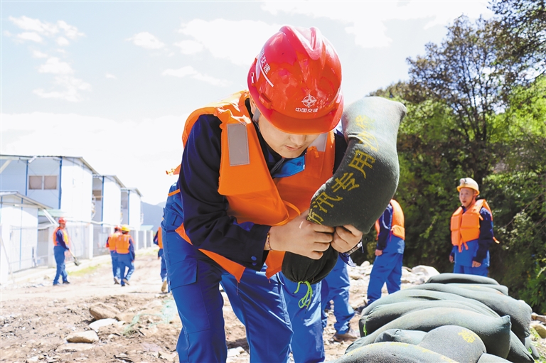 ?图为应急救援人员正在进行筑堤防汛作业。