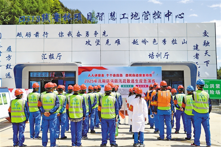 为切实提升全员防洪避险意识和自救互救能力,强化风险隐患排查处置效能,筑牢安全生产防线,近日,中国交建西藏工程建设项目三工区在色季拉山隧道出口端,组织开展2025年汛期防洪防汛疏散逃生应急演练。