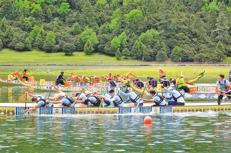 2025年西藏林芝南迦巴瓦高原体育大会重要组成部分——“2025中尼高原龙舟友谊赛”近日在林芝市鲁朗镇开赛。赛事选址海拔3000多米的扎塘鲁措湖,14支队伍、230余名健儿在此展开激烈角逐。赛事设置了龙舟直道赛公开组100米、200米及友城组200米项目,以及传统牛皮船直道100米赛。来自尼泊尔、新加坡等国家及地区的龙舟队受邀参赛,与中国队伍同场竞技,以桨为媒,深化理解,播种情谊。