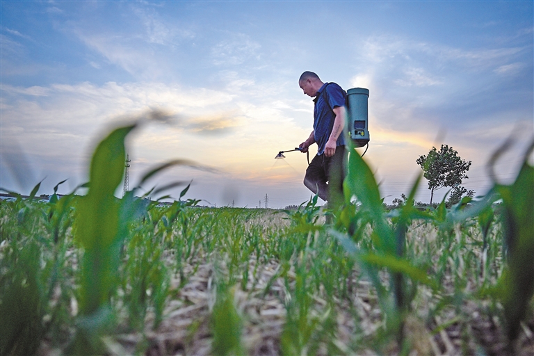 ?6月17日,河南省商丘市夏邑县会亭镇南街村村民在玉米田喷施除草剂。新华社发(王高超 摄)