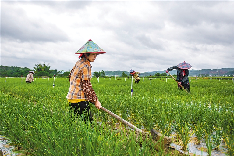 ▼6月19日,广西南宁市兴宁区五塘镇两山村菜农管护韭菜。新华社发(赵京武 摄)