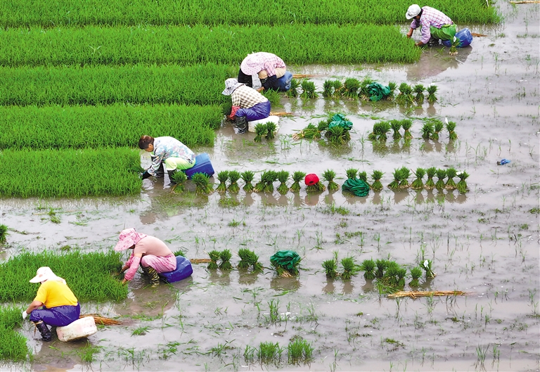 ▲6月20日,在江苏里下河地区农科所(扬州市农科院),农民在水稻田里起秧(无人机照片)。新华社发(孟德龙 摄)