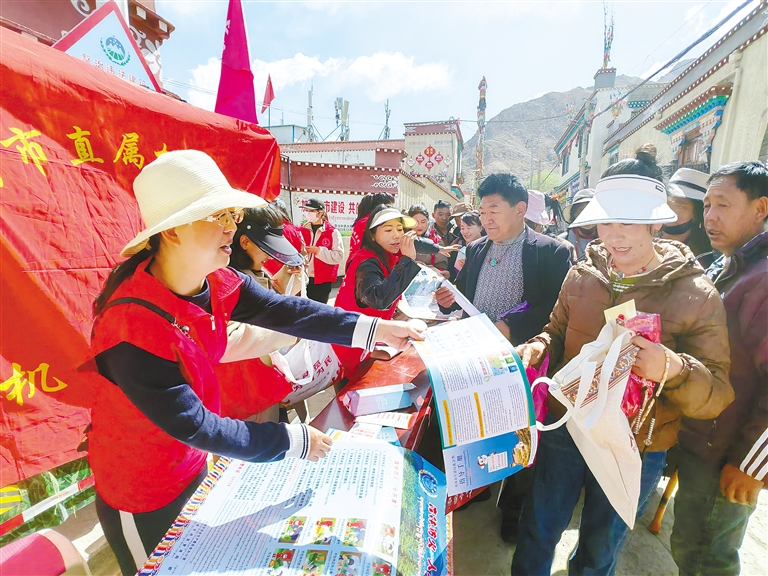 图②:山南市直机关工委组织干部在乃东区泽当街道泽当社区发放民族团结相关宣传手册。