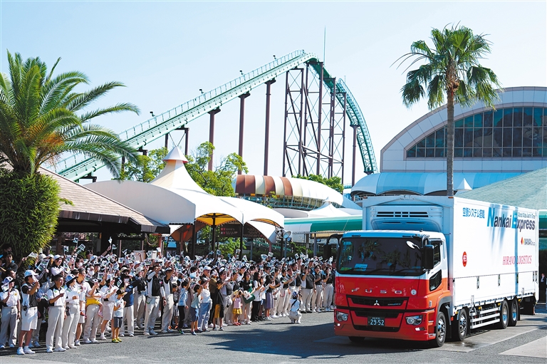 图为6月28日,工作人员与当地民众在日本和歌山县冒险世界游乐园外目送运输大熊猫的卡车离开。