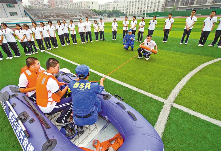 7月2日,河北省遵化市第一中学的学生在体验水上救援过程。新华社发(刘满仓 摄)