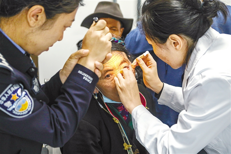 图为医疗队专家在为群众检查眼睛。