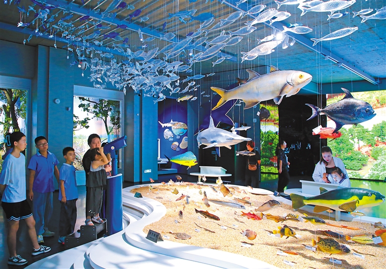 图①:7月6日,家长带着孩子在位于浙江省玉环市的玉环博物馆参观游览。