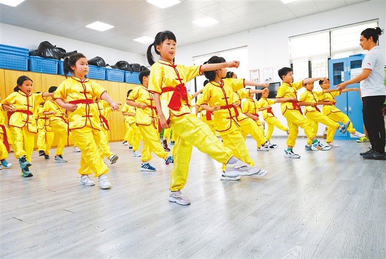 图②:7月7日,小学员们在上海黄浦区老西门街道的爱心暑托班练习少年连环拳。