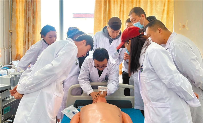 图为临床技能培训中,援藏干部人才在模拟人上示范操作。 本报记者 永青 洛桑旦增 摄