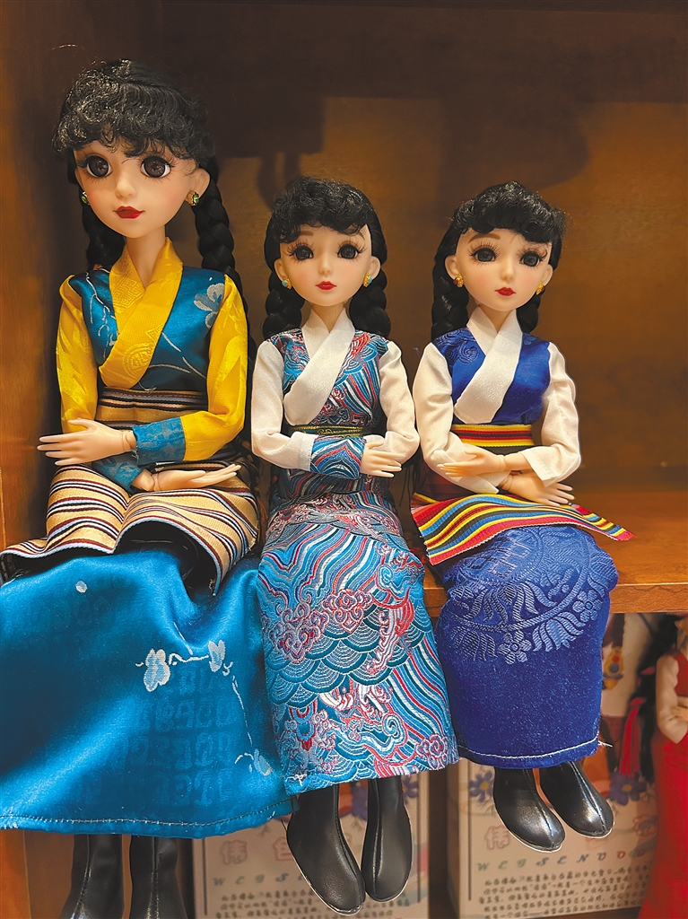 当行至二楼文创区,一隅活力景象,骤然点亮历史的深沉,一排排“拉飒姑娘”布娃娃,身着华丽藏装静静伫立,吸引游客驻足流连。