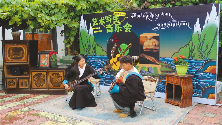 在音乐鉴赏环节,拓岗扎念乐队将传统扎念琴演奏与现代音乐结合,表演了《卓木仁青岗》等曲目;青年歌手次仁罗布演唱藏族民歌,展现非遗特色。在艺术对谈中,青年画家雍忠卓玛分享了自己克服身体障碍坚持创作的经历,围绕“自然与艺术的关系”展开讨论,结合作品从藏族文化和乡土景观中获取创作灵感的过程。在写生体验环节,活动参与者以德庆镇民居和周边自然景色为素材进行创作,雍忠卓玛从构图、色彩运用等方面给予指导,帮助活动参与者完成10余幅绘画作品。
