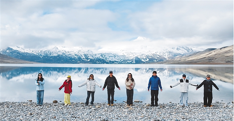 游客在崇巴雍错景区打卡拍照。 本报记者 旦增嘎瓦 摄