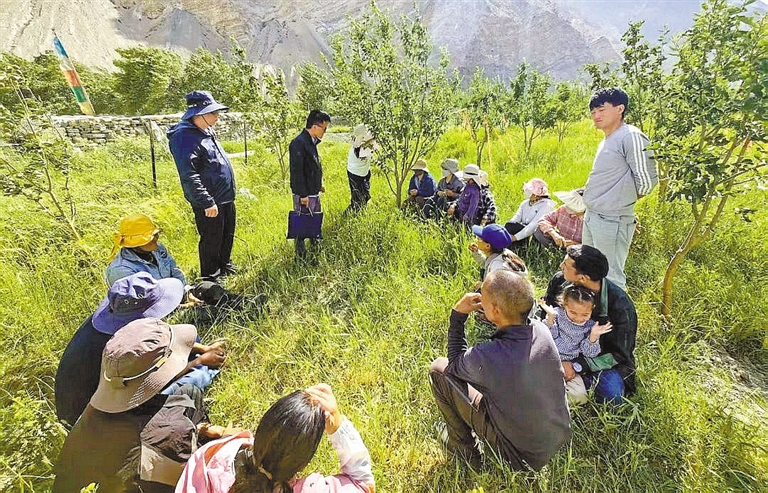 图为河北省石家庄市林业局援藏干部人才与阿里地区札达县农牧业综合服务管理中心农技人员在札达县底雅乡教授当地村民果树优质丰产管理技术 。 本报记者 永青 达珍 摄