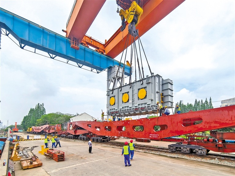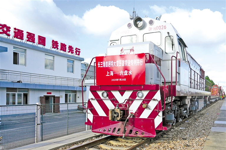 7月20日晚,载有两台单体重量达330吨特大型变压器的货运专列从上海闵行站开出,驶往贵州省六盘水市,标志着长三角铁路首次特大型变压器运输顺利启动。
