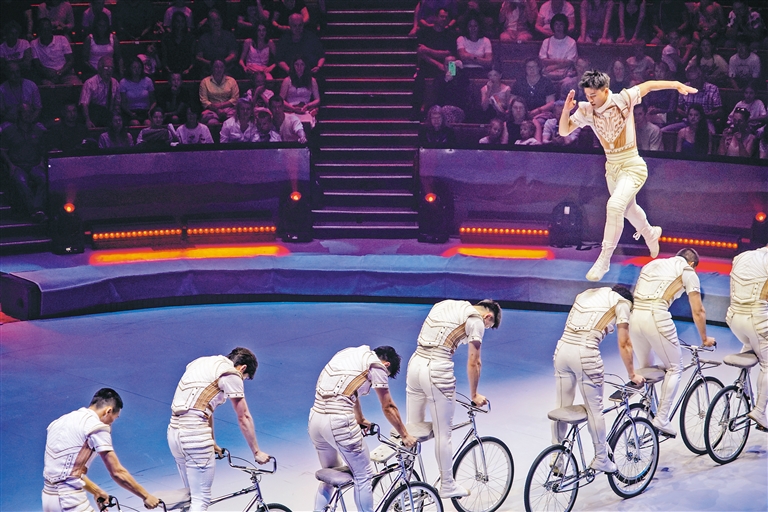 图为7月20日,在俄罗斯莫斯科,中国杂技团演员表演《驭风凌霄——男子集体车技》。新华社记者 孟菁 摄