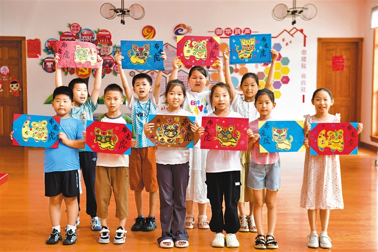 图为7月23日,在博兴县城东街道御华社区“滨滨学堂”,孩子们展示自己制作的布老虎贴画。