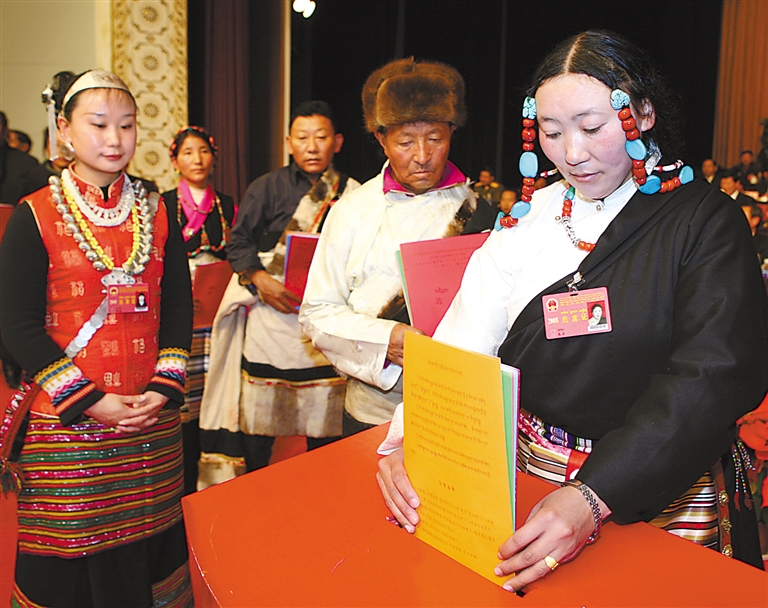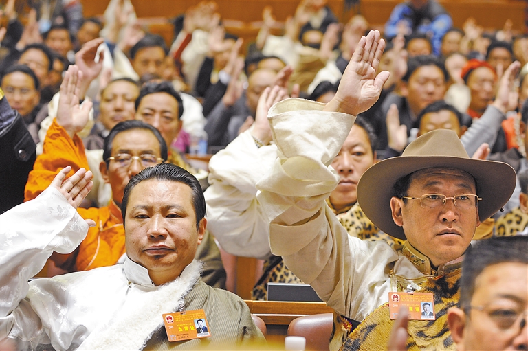 在旧西藏,占总人口不到5%的三大领主(官家、贵族和寺院上层僧侣)占有全部生产资料,而占总人口95%以上的农奴和奴隶没有人身自由。西藏民主改革特别是西藏自治区成立以来,民族区域自治制度得到坚决贯彻,各族人民参与民主政治建设的热情持续高涨:农奴的后代当选人大代表,通过人民代表大会制度参与国家治理;截至目前,全区四级人大代表42000余人中,藏族和其他少数民族约占89%;门巴、珞巴等人口不足万人的民族,在全国及西藏人大均有代表——雪域高原各族儿女依法行使民主权利,真正成为命运的主宰者。