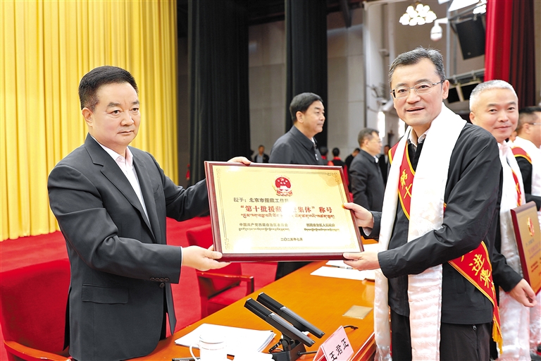 7月28日,全区第十批、第十一批援藏干部人才迎送大会在拉萨召开。自治区党委书记王君正、中组部部务委员兼干部一局局长石军出席并讲话。这是王君正向受表彰先进集体颁奖。本报记者 白玛泽旺 摄