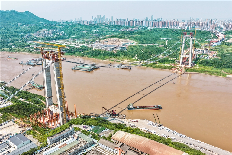 7月30日,由重庆城投集团投资、城投建设公司组织建设、中国铁建大桥局承建的黄桷沱长江大桥顺利完成主缆架设工作,标志着大桥建设即将进入钢桁梁吊装工序。黄桷沱长江大桥全长1260米,主跨765米,为单跨悬吊双塔三跨连续钢桁梁悬索桥,是国内最大跨径公轨两用悬索桥。黄桷沱长江大桥是渝长高速复线连接道工程的控制性节点工程,建成后将成为联系重庆主城区长江南北两岸的重要交通干道。