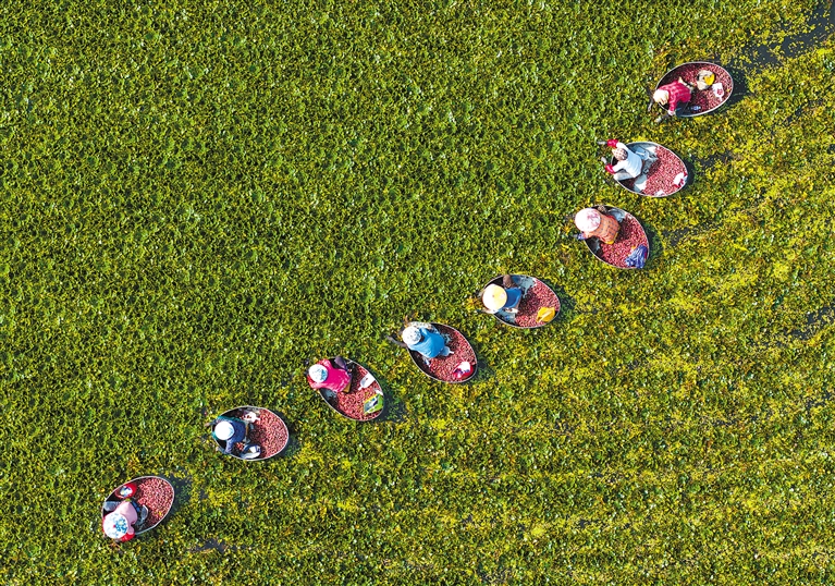 图为8月7日,在江苏省淮安市洪泽区岔河镇,村民划着菱桶在水面上采收菱角(无人机照片)。新华社发(贺敬华 摄)