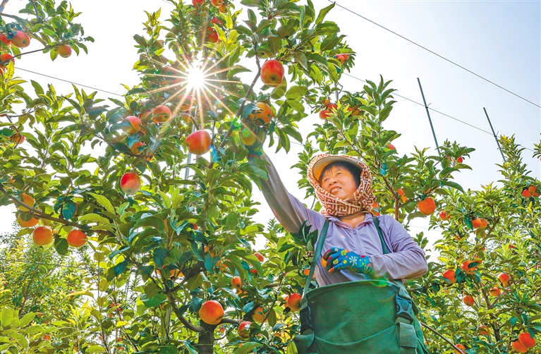 图为8月7日,果农在山东省东营市广饶县大王镇的一处苹果种植基地内采摘苹果。新华社发(刘云杰 摄)
