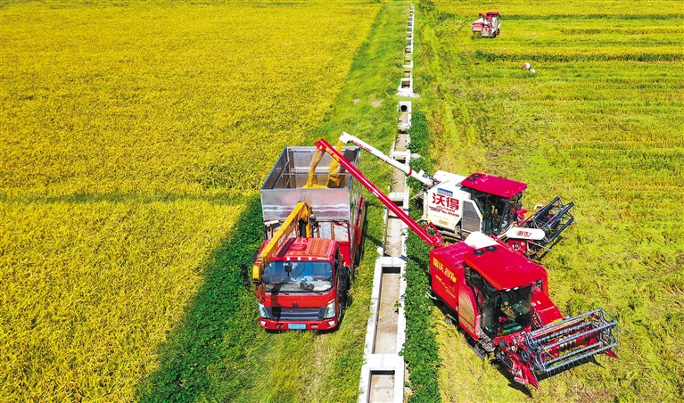 图为8月7日,在浙江省温岭市箬横镇百亩坦村,农民在田头开展早稻收割作业(无人机照片)。新华社发(周学军 摄)