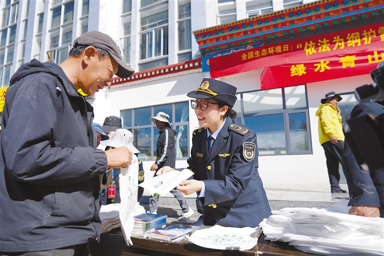 在法规宣讲环节,工作人员通过设立宣传展板、悬挂宣传横幅、发放政策法规手册、现场接受群众咨询答疑等形式,向群众集中宣传《中华人民共和国青藏高原生态保护法》及自治区实施办法等生态环保法律法规。