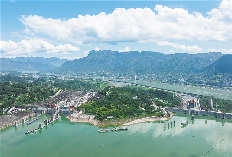 图为8月16日,在湖北省宜昌市,船舶有序通过三峡双线五级船闸和三峡升船机(无人机照片)。新华社发(郑家裕 摄)