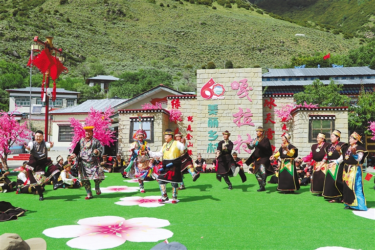 上图:林芝市巴宜区主办的“嘎拉村村民的心声——感恩总书记·共建新家园”庆祝西藏自治区成立60周年主题文艺演出,近日在林芝镇嘎拉村团结广场举行。本报记者 谢筱纯 王珊 摄
